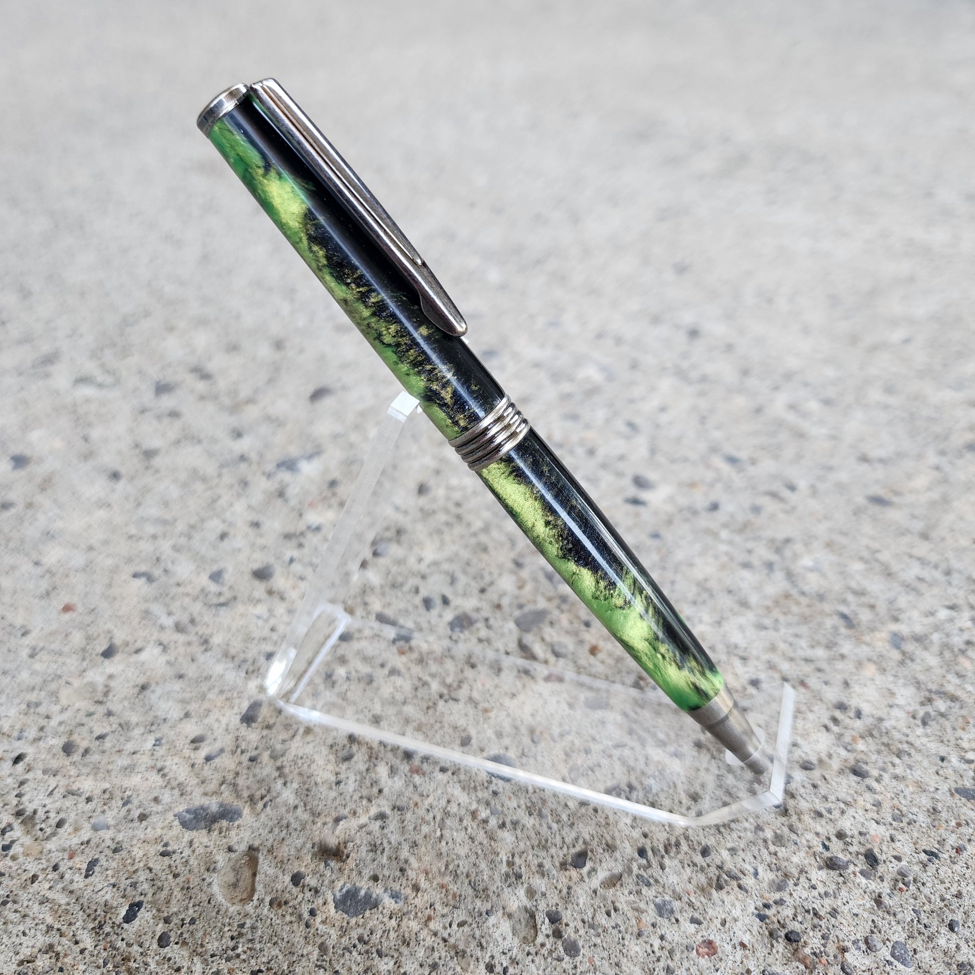 This pen was made by mixing resin and mica powder together, pouring the colors together in a pen blank mold and waiting for them to cure. They are then drilled, pen tube installed and turned on a lathe.