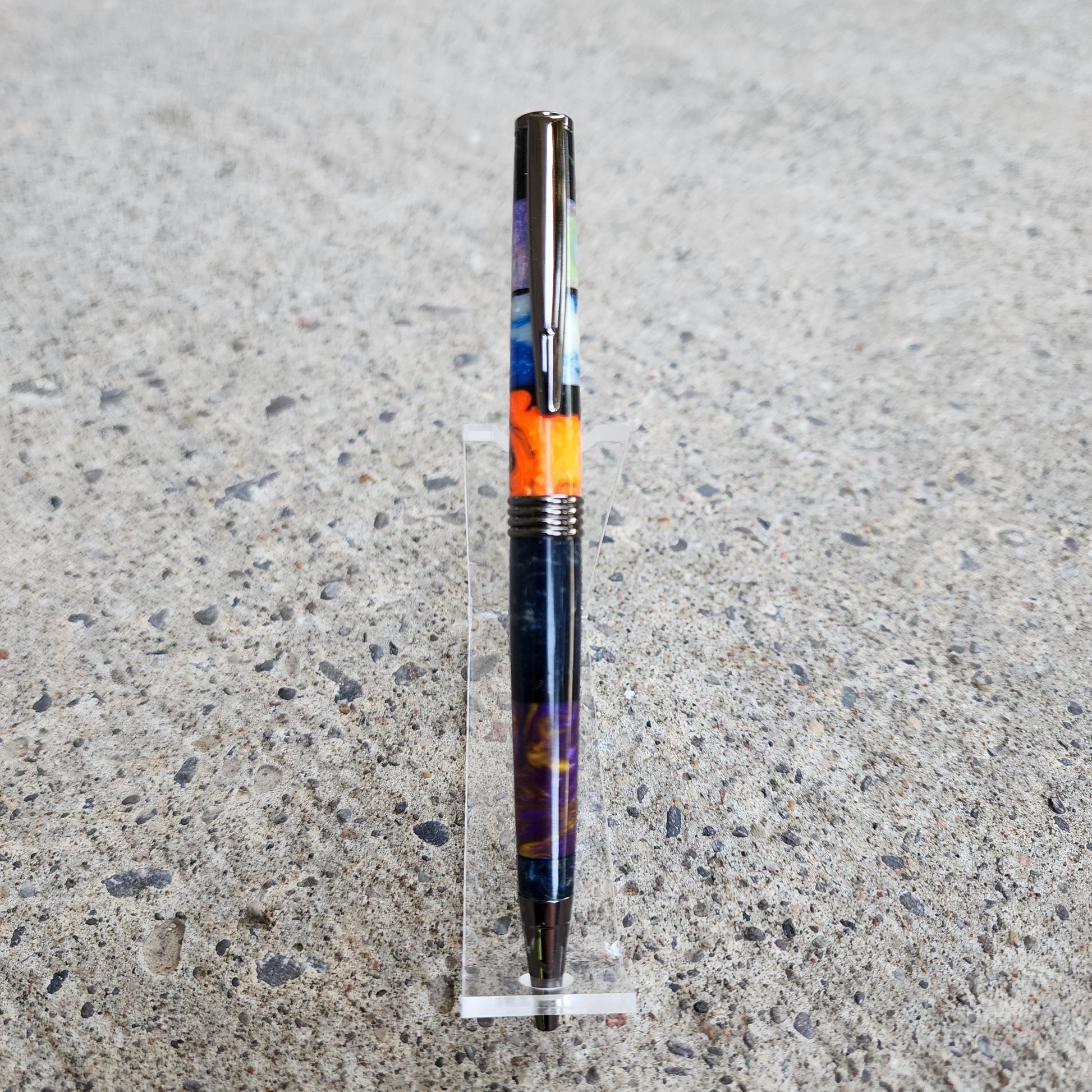 This pen was made by mixing resin and mica powder together, pouring the colors together in a pen blank mold and waiting for them to cure. They are then drilled, pen tube installed and turned on a lathe.