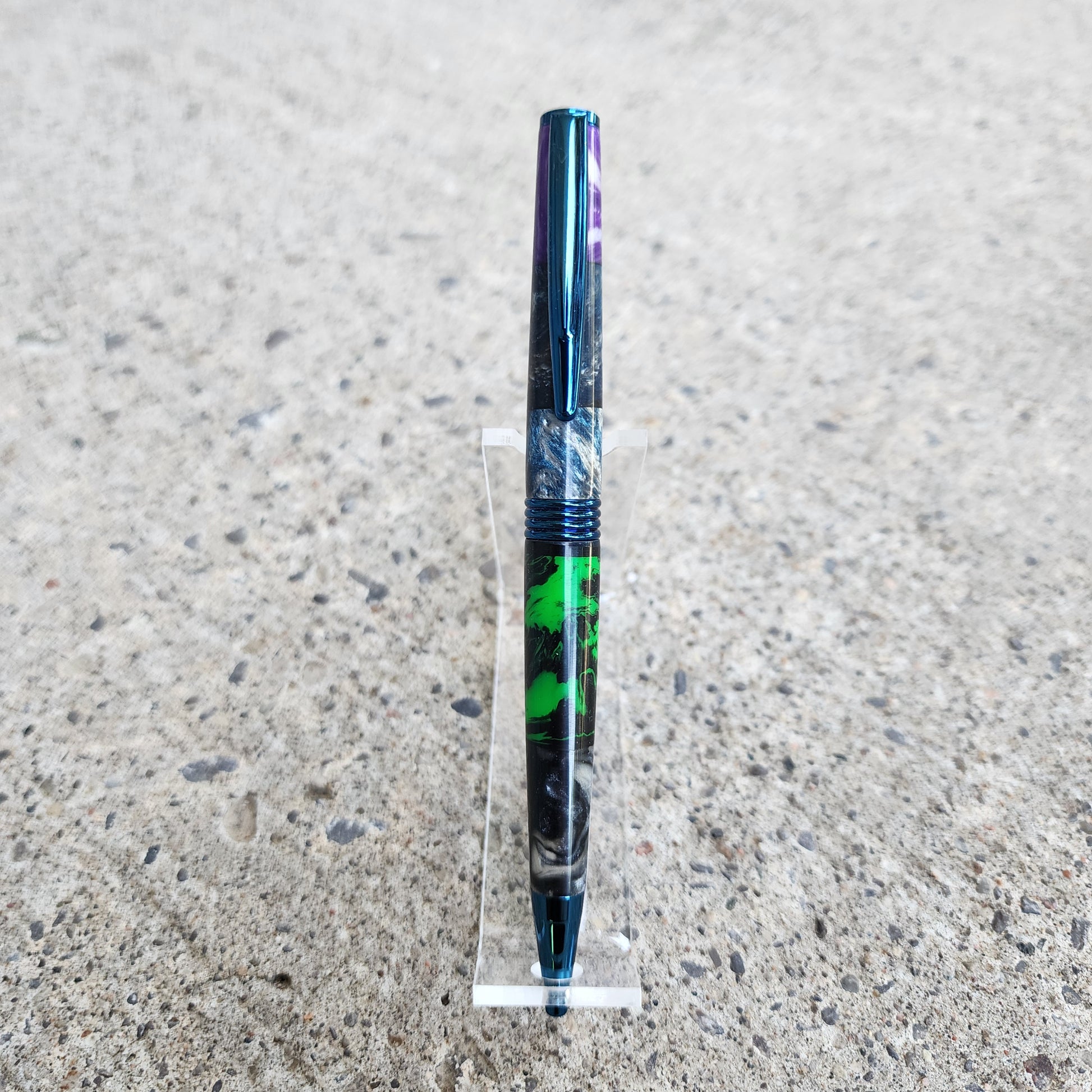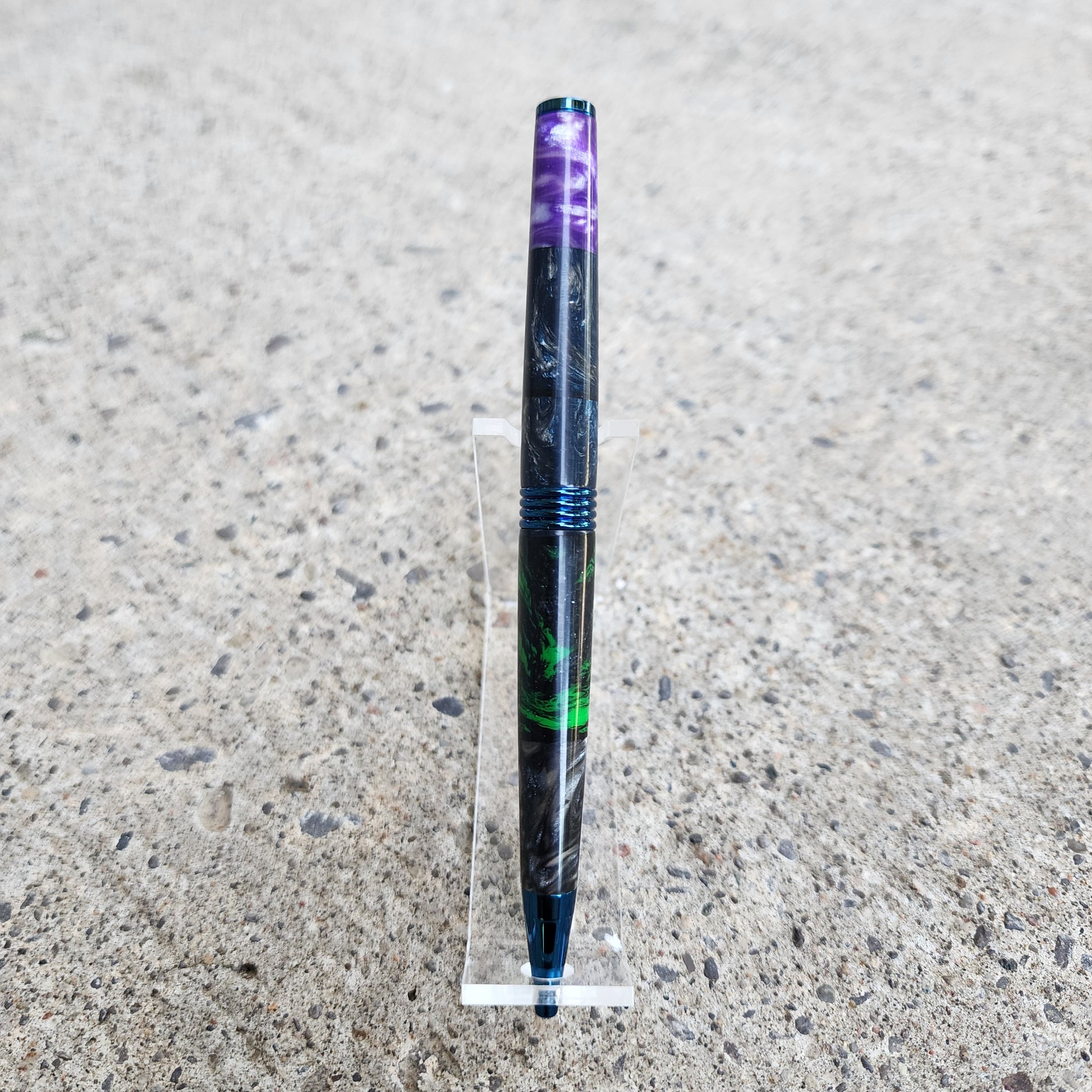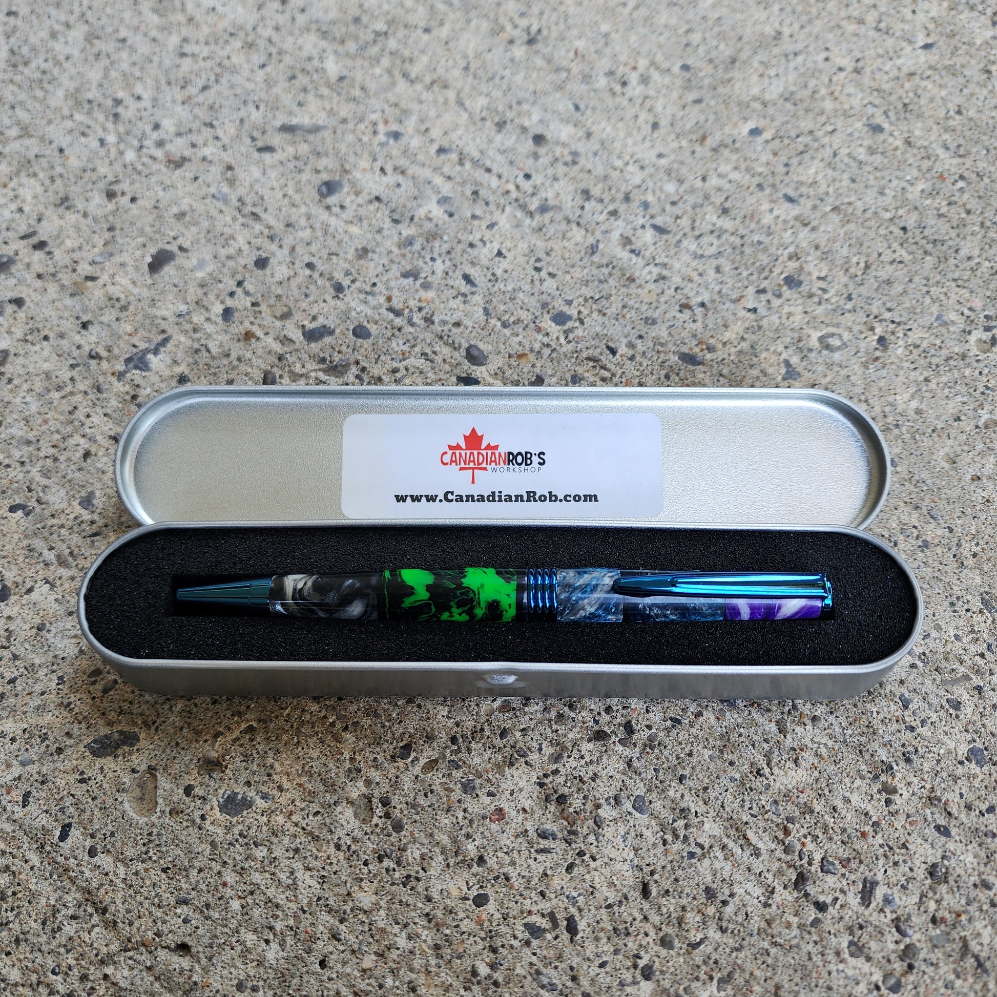 This pen was made by mixing resin and mica powder together, pouring the colors together in a pen blank mold and waiting for them to cure. They are then drilled, pen tube installed and turned on a lathe.
